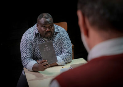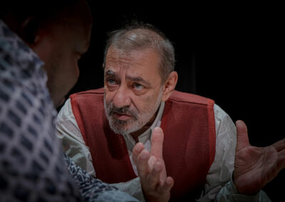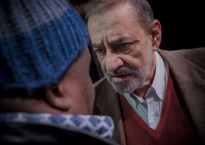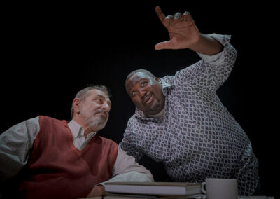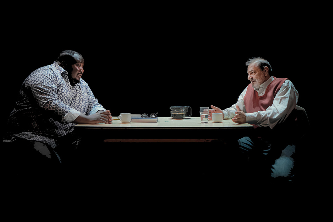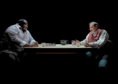 Τη μετάφραση και σκηνοθεσία υπογράφει ο Αντώνης Καφετζόπουλος, ο οποίος συμπρωταγωνιστεί με τον Ζερόμ Καλούτα σε μια σπαρακτική σύγκρουση δύο αντιδιαμετρικών κόσμων – πίστης και απόγνωσης, φωτός και σκότους. Ένα έργο λόγου και εσωτερικής έντασης, μια υπαρξιακή μονομαχία για το τι αξίζει να κρατήσει έναν άνθρωπο στη ζωή.
