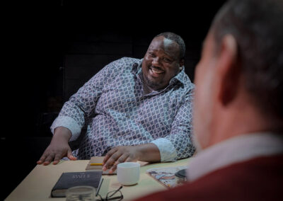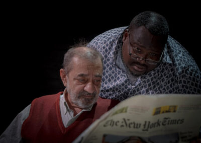 Είναι αδύνατο δυστυχώς να αποδοθεί η προφορικότητα του αφροαμερικάνου Black. Δεν έχουμε κάτι αντίστοιχο στις παραλλαγές της δικής μας γλώσσας. Η διάλεκτος που μιλάει, είναι τα αγγλικά που αναγκάστηκαν να μάθουν οι σκλάβοι πρόγονοι του όταν έφτασαν δια της βίας απο την Αφρική στα βαμβακοχώραφα του αμερικανικού Νότου. Επέλεξα μια ελαφρά πιο «λαϊκή» εκφραστικότητα για τον Μαύρο σε αντίθεση με την συγκρατημένα περίτεχνη γλώσσα του Λευκού καθηγητή. Η μεγαλύτερη πρόκληση φυσικά, είναι η “υλοποίηση” ενός απόλυτα διαλογικού θεατρικού κειμένου σε κατι ελκυστικό στη θεατρική σκηνή. Το Έβερεστ του σκηνοθέτη όμως, το υποδόριο χιούμορ και ο σαρκασμός που κυριαρχούν σε όλη σχεδόν τη διάρκεια της αναμέτρησης των δυο χαρακτήρων, τα πειράγματα και η ειρωνία οδηγούν πιστεύω σε υψηλή απόλαυση. Μέσα στην αμείλικτη σκληρότητα που αποπνέει το θέμα. Και πάντα, η δυσκολότερη αναμέτρηση στη θεατρική πράξη είναι η προσπάθεια που κάνουμε ‘εμείς’ επάνω στη σκηνή, με την ενδόμυχη προσδοκία του θεατή να ‘εξαπατηθεί’ ώστε να πιστέψει – έστω για κλάσματα δευτερολέπτου – ότι σε ένα παράλληλο σύμπαν τα πρόσωπα και οι καταστάσεις που παρακολουθεί είναι όντως ‘πραγματικά’.
