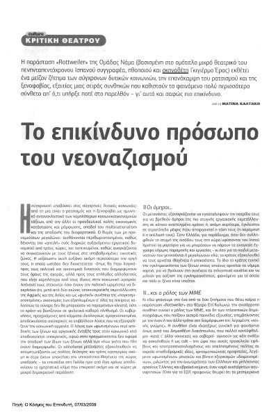 Η πολύμηνη δουλειά μας πάνω στο κείμενο του Guillermo Heras, «Rottweiler», ήταν πρόκληση και έρευνα. Ως Ομάδα Νάμα εμπνευστήκαμε από το έργο τόσο, ώστε, με την έγκριση του συγγραφέα, επιχειρήσαμε να το διευρύνουμε θεματικά επεμβαίνοντας στο αρχικό κείμενο δίνοντας έμφαση στην ανάπτυξη των χαρακτήρων και της πλοκής. Κάναμε επίσης μια απόπειρα να φωτίσουμε εκείνα τα στοιχεία του έργου που είχαν περισσότερο παγκόσμιο παρά τοπικό χαρακτήρα, στη συγκεκριμένη περίπτωση ισπανικό.
