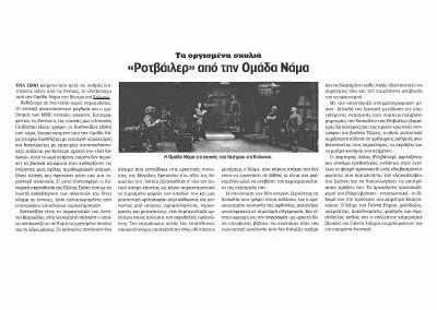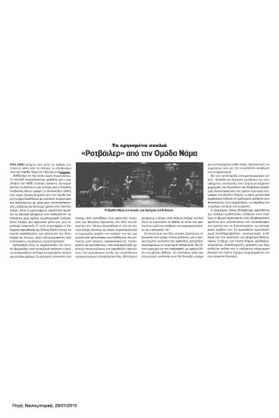 Η πολύμηνη δουλειά μας πάνω στο κείμενο του Guillermo Heras, «Rottweiler», ήταν πρόκληση και έρευνα. Ως Ομάδα Νάμα εμπνευστήκαμε από το έργο τόσο, ώστε, με την έγκριση του συγγραφέα, επιχειρήσαμε να το διευρύνουμε θεματικά επεμβαίνοντας στο αρχικό κείμενο δίνοντας έμφαση στην ανάπτυξη των χαρακτήρων και της πλοκής.  Κάναμε επίσης μια απόπειρα να φωτίσουμε εκείνα τα στοιχεία του έργου που είχαν περισσότερο παγκόσμιο παρά τοπικό χαρακτήρα, στη συγκεκριμένη περίπτωση ισπανικό.
